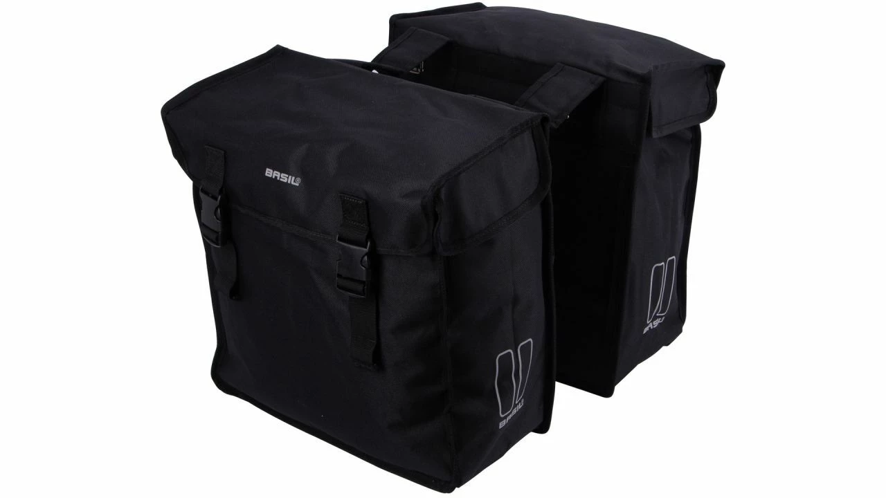 Die Mara XXL von BASIL ist eine moderne und stilvolle Fahrradtasche. Diese doppelte Fahrradtasche lässt sich leicht am Gepäckträger eines Damen- oder Herrenfahrrads befestigen. Es handelt sich um eine Fahrradtasche, die sich für viele Zwecke anbietet. Dank ihrem überraschend großen Inhalt von 47 l und ihrer ausgezeichneten Qualität ist die Mara XXL ideal fürs Einkaufen gehen oder eine lange Radtour.<br><br>In der Tasche lassen sich jede Menge Einkäufe verstauen oder leere Flaschen zur Pfandrückgabe mitnehmen. Sie ist aus wasserabweisendem 600D Polyester gefertigt und spritzwasserdicht. Weiterhin hat die Fahrradtasche vorne und hinten doppelte Reflektorstreifen. Hiermit ist man auch in Dunkelheit während einer kurzen oder langen Fahrradfahrt gut sichtbar. <br><br>Die Fahrradtasche fällt aufgrund ihrer vorgefertigten und abgesteppten Aussparungen für Gepäckträger-Spanngurte, ihres biegsamen Materials und ihrer praktischen Schnallen auf. Wer eine hochwertige, doppelte Fahrradtasche sucht, ist bei der BASIL Mara XXL genau richtig.