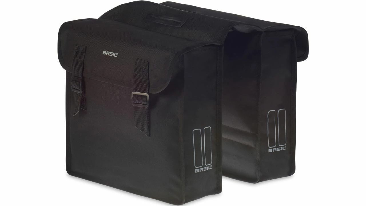 Bei der Mara von BASIL handelt es sich um eine moderne und stilvolle Fahrradtasche. Diese Doppelpacktasche lässt sich leicht am Gepäckträger eines Damen- oder Herrenfahrrads befestigen. Es handelt sich um eine Fahrradtasche, die sich für viele Zwecke anbietet.<br><br>Dank ihrem überraschend großen Inhalt von 26 l und ihrer ausgezeichneten Qualität ist die BASIL Mara ideal fürs Einkaufen gehen oder eine lange Fahrradtour. In der Tasche lassen sich jede Menge Einkäufe verstauen oder leere Flaschen zur Pfandrückgabe mitnehmen. Die Tasche ist aus wasserabweisendem 600D Polyester gefertigt. Damit handelt es sich um eine spritzwasserdichte Fahrradtasche.<br>Weiterhin hat die Fahrradtasche vorne und hinten doppelte Reflektorstreifen. Hiermit ist man auch in Dunkelheit während einer kurzen oder langen Fahrradfahrt gut sichtbar. Die Fahrradtasche fällt aufgrund ihrer vorgefertigten und abgesteppten Aussparungen für Gepäckträgerspanngurte, ihres biegsamen Materials und ihrer praktischen Schnallen auf.<br><br>Wer eine hochwertige, doppelte Fahrradtasche sucht, findet in der BASIL Mara die genau richtige Doppelpacktasche für sich.