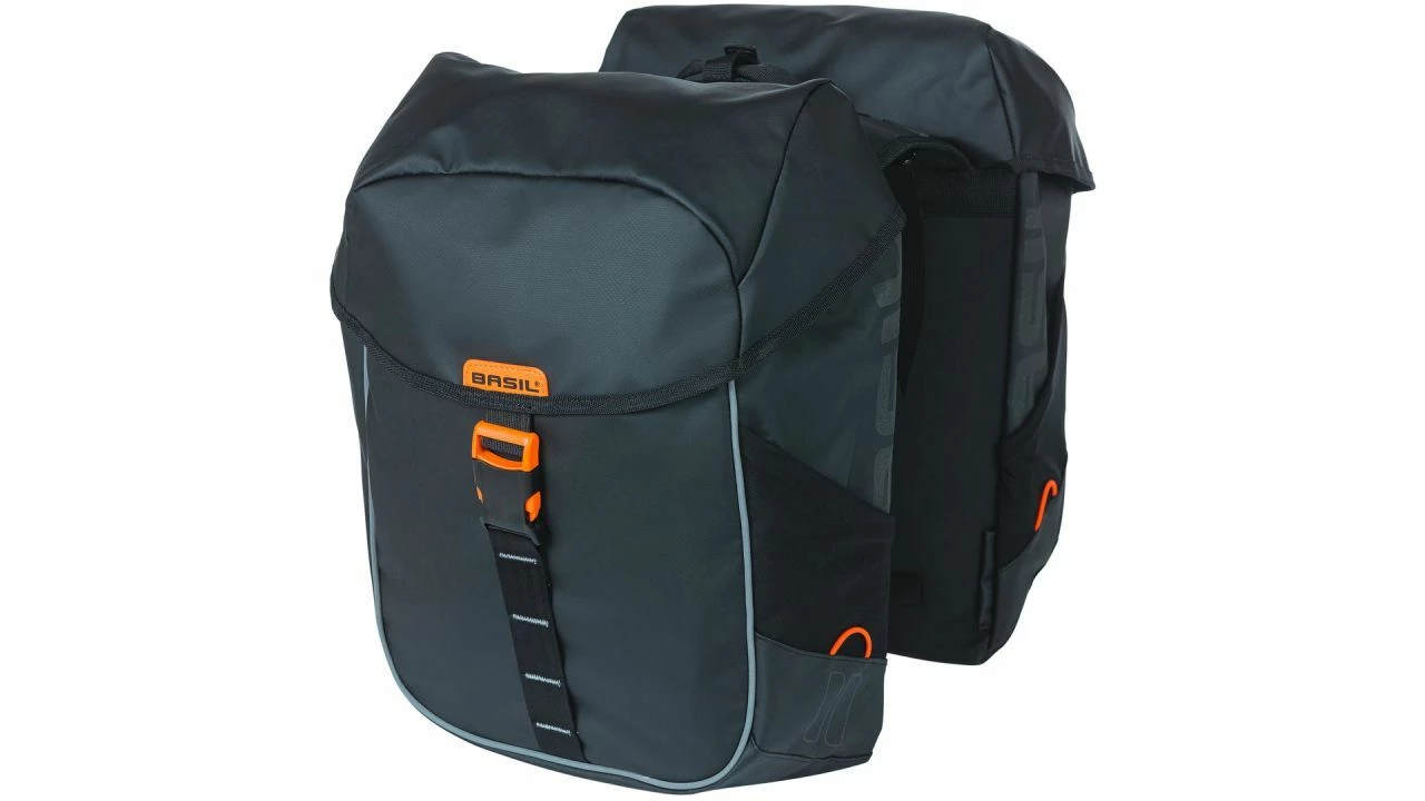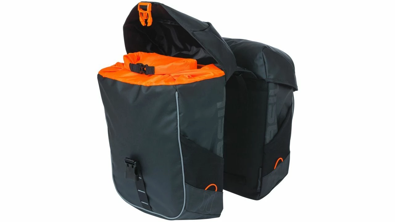 Keine Ausreden mehr und ab auf die nächste Tour! Das Wetter spielt keine Rolle. Die BASIL Doppeltasche Miles machts möglich, denn sie ist aus wasserdichtem Tarpaulin (IPX3) gefertigt und hält somit auch kräftigen Regenschauern stand. <br><br>Mit einer Kapazität von 34 Litern ist in der Doppeltasche genug Platz für Wechselkleidung. Der praktische Rollverschluss mit Druckknopf unterstützt zusätzlich, dass der Inhalt trocken bleibt. Damit du im Straßenverkehr besser gesehen wirst, ist die Tasche mit reflektierenden Elementen versehen. Kleine Schlaufen bieten die Möglichkeit, zusätzliche LED-Leuchten anzuklemmen. <br><br>Die Tasche gibt es mit zwei verschiedenen Befestigungsvarianten. Entweder ist sie mit dem Universal Bridge System ausgestattet und ist somit kompatibel mit Trägersystemen von MIK, Racktime oder BASIL DBS. Oder du wählst eine Tasche mit vormontierter MIK-Adapterplatte. Dann kannst du sie zusammen mit einer MIK-Trägerplatte auf dem Gepäckträger befestigen.