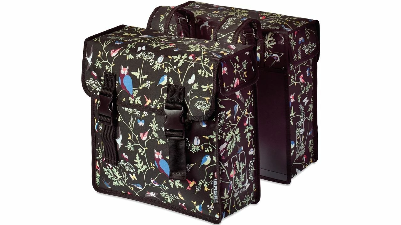 Bei der Wanderlust Double Bag handelt es sich um eine schwarze doppelte Fahrradtasche mit farbenfrohem Vogelmuster. Mit dieser trendigen Fahrradtasche gehen Sie gut gelaunt zum Supermarkt oder die Freundin besuchen. <br><br>Soll es unterwegs regnen? Kein Problem! In diesem Fall sorgt das wasserabweisende Material dafür, dass der Inhalt der Tasche trocken bleibt. <br>Die doppelte Fahrradtasche hat an der Oberseite 2 Bänder für zum Beispiel Gepäckträger-Spanngurte, einen Kindersitz oder eine Federklappe. <br><br>Die Fahrradtasche ist mithilfe von Steckschnallen verschließbar. Sie ist für diverse Gepäckträger (auch von E-Bikes) geeignet. Die Reflektordetails an den Seiten sorgen dafür, dass man in Dunkelheit besser sichtbar ist. Der Inhalt dieser doppelten Fahrradtasche beträgt 35 l. Dies bietet genug Platz für Einkäufe, Kleidung oder andere Gegenstände.