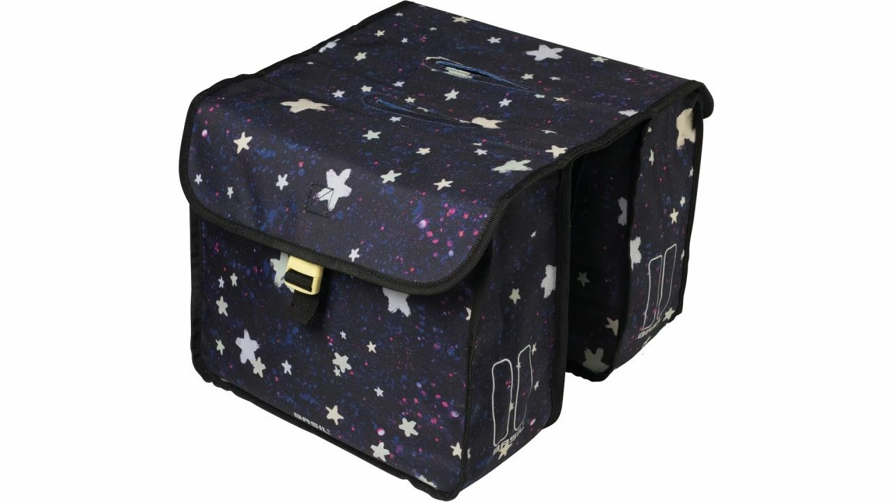 Bei der BASIL Stardust Double Bag handelt es sich um eine coole, doppelte Fahrradtasche, die sich am Gepäckträger eines Kinderfahrrads befestigen lässt. Wenn Ihr Sohn oder Ihre Tochter in Kürze Geburtstag hat oder Sie einfach eine nette Überraschung suchen, dann ist diese stylishe doppelte Fahrradtasche sicher eine gute Idee.<br><br>Diese doppelte Fahrradtasche ist ideal, wenn Sie sich gerne zusammen mit Ihren Kindern aufs Fahrrad schwingen und tolle Fahrradtouren erleben. Vielleicht erledigen Sie auch gerne zusammen Einkäufe oder benutzen das Fahrrad gerne für eine Tour in der Umgebung? Gute Fahrradtaschen sind sehr nützlich für das Einkaufen oder während einer Fahrradtour in der Natur. <br><br>Mit einem Inhalt von bis zu 20 l lassen sich darin eine Menge an Gegenständen mitnehmen, wie zum Beispiel Regenkleidung, ein Lunchpaket oder eine Picknickdecke. Dank des wasserabweisenden Polyesters halten die Fahrradtaschen auch prima einen Regenschauer aus.<br>Die reflektierenden Streifen an den Seiten sorgen dafür, dass Ihr Sohn oder Ihre Tochter stets sicher mit dem Fahrrad unterwegs ist. Die ausgelassenen und abgesteppten Aussparungen für Gepäckträgerspanngurte runden die doppelte Fahrradtasche ab. Selbstverständlich lässt sich diese Tasche leicht am Gepäckträger eines Kinderfahrrads montieren.