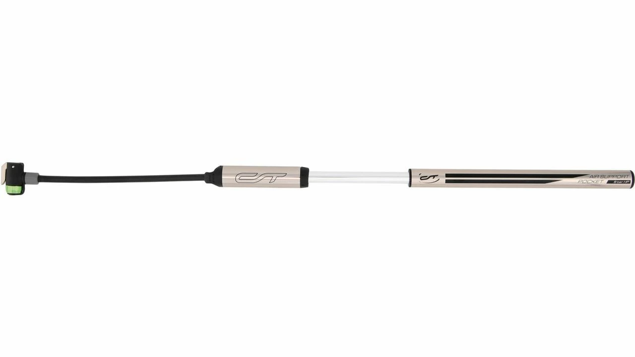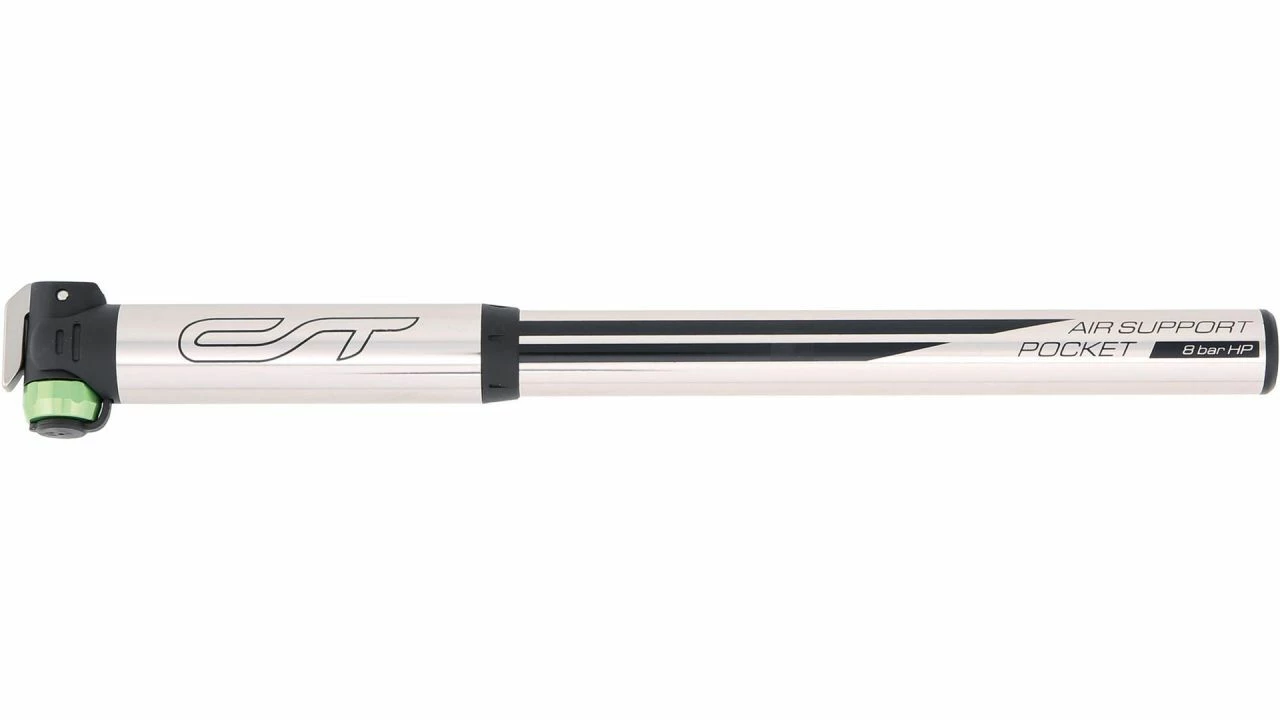 Ob am Wochenende im Bikepark oder bei ausgedehnten Radtouren: Die CONTEC Minipumpe Air Support Pocket Chrome findet überall Platz und sorgt dafür, dass dem Fahrvergnügen nicht die Puste ausgeht.<br><br>Die kleine Pumpe aus Aluminium, mit ausziehbarem Kopf, kann dank des kompakten Flip-Valve-Pumpenkopf-Systems schnell und ohne Werkzeug für alle Ventile passend umgebaut werden. Der Hebel am Kopf ermöglicht ein sicheres Feststellen des Pumpenkopfes auf dem Ventil und einfachste Bedienung. <br><br>Zudem ist der praktische Flip-Valve-Head mit einem flexiblen Schlauch verbunden, der bis zu 15 cm ausgezogen werden kann und das Aufpumpen erleichtert.<br>Für die leistungsstarke Air Support Pocket Chrome sind 8 bar bzw. 120 psi kein Problem: ideal für Hochdruck-Bereifung am Rennrad.<br><br>Die Fahrradpumpe im attraktiven Chrome-Look mit einer Länge von nur 270 mm und einem Durchmesser von 19 mm wird mit einer Befestigung für den Flaschenhaltersockel geliefert, wo sie jederzeit griffbereit ist.<br>Klein und hochwertig verarbeitet: die optimale Luftpumpe für unterwegs.