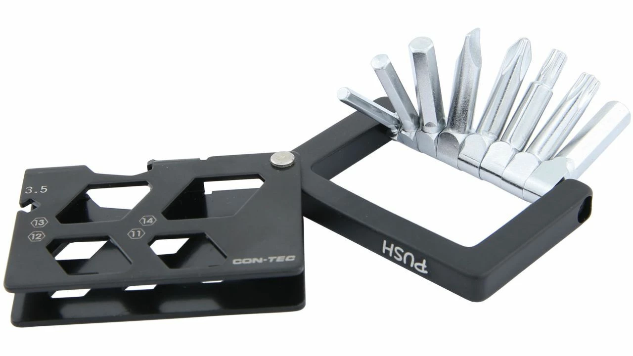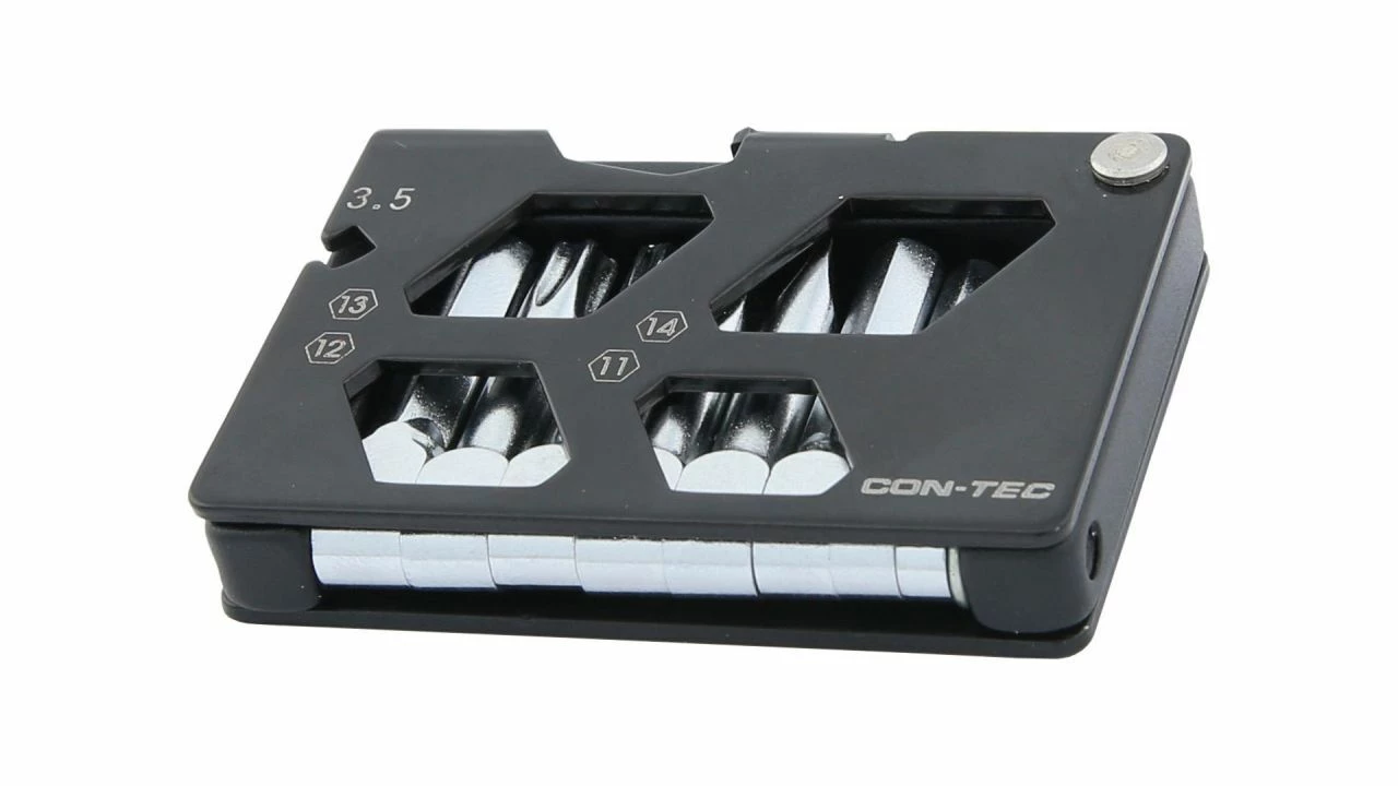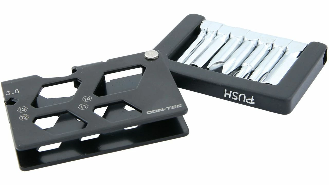 Am Fahrrad treten schnell einmal kleinere Defekte und Mängel auf. Diese lassen sich mit dem passenden Werkzeug jedoch zumeist rasch wieder beseitigen. Mit dem CONTEC Multifunktionswerkzeug Pocket Gadget – PG3 haben Radfahrer stets ein vielseitiges und hochwertiges Tool parat. Dank des flachen und kompakten Designs passt das Werkzeug in jede Hand- und Fahrradtasche. Das sehr geringe Gewicht von nur 118,5 g macht das Produkt von CONTEC zum idealen Hilfsmittel für die Werkstatt daheim, die Radtour in der Stadt sowie unterwegs auf der Strecke.<br><br>Insgesamt verfügt das praktische Multifunktionswerkzeug über 21 verschiedene Funktionen. Vorhanden sind verschieden lange Innensechskantschlüssel, ein 4-mm-Schlitz- und ein 2-mm-Kreuzschraubendreher, ein Torxschlüssel, viele verschieden lange Box-Schraubenschlüssel, ein 3,2-mm-Speichenschlüssel und ein 3,5-mm-Kapselheber. <br><br>So ist jeder Radfahrer mit dem Profi-Tool von CONTEC optimal auf alle Eventualitäten vorbereitet.