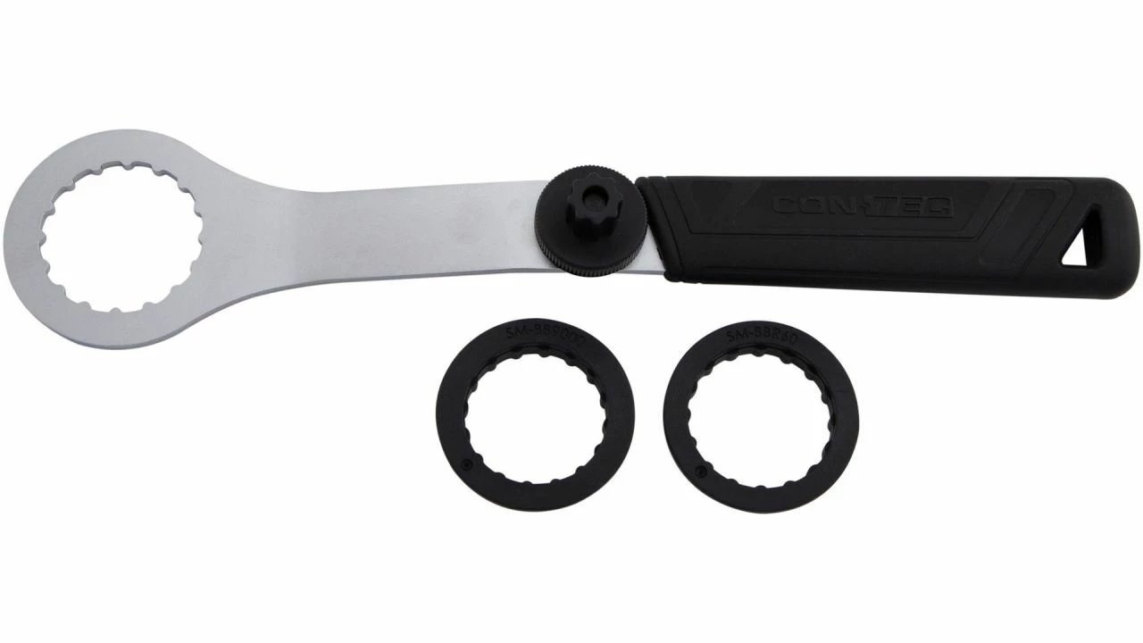 Der Kurbelabzieher TFP-130 von CONTEC ist für die Montage oder Demontage von externen Tretlagern wie Hollowtech II, von Truvativ, FSA Magaexo und Campagnolo Ultra Torque gemacht. Mit dabei sind zwei Adapter für die Shimano-Ausführungen SM-BB9000/BB93 und SM-BBR60. Aus Stahl gefertigt und mit ergonomisch geformtem Griff.