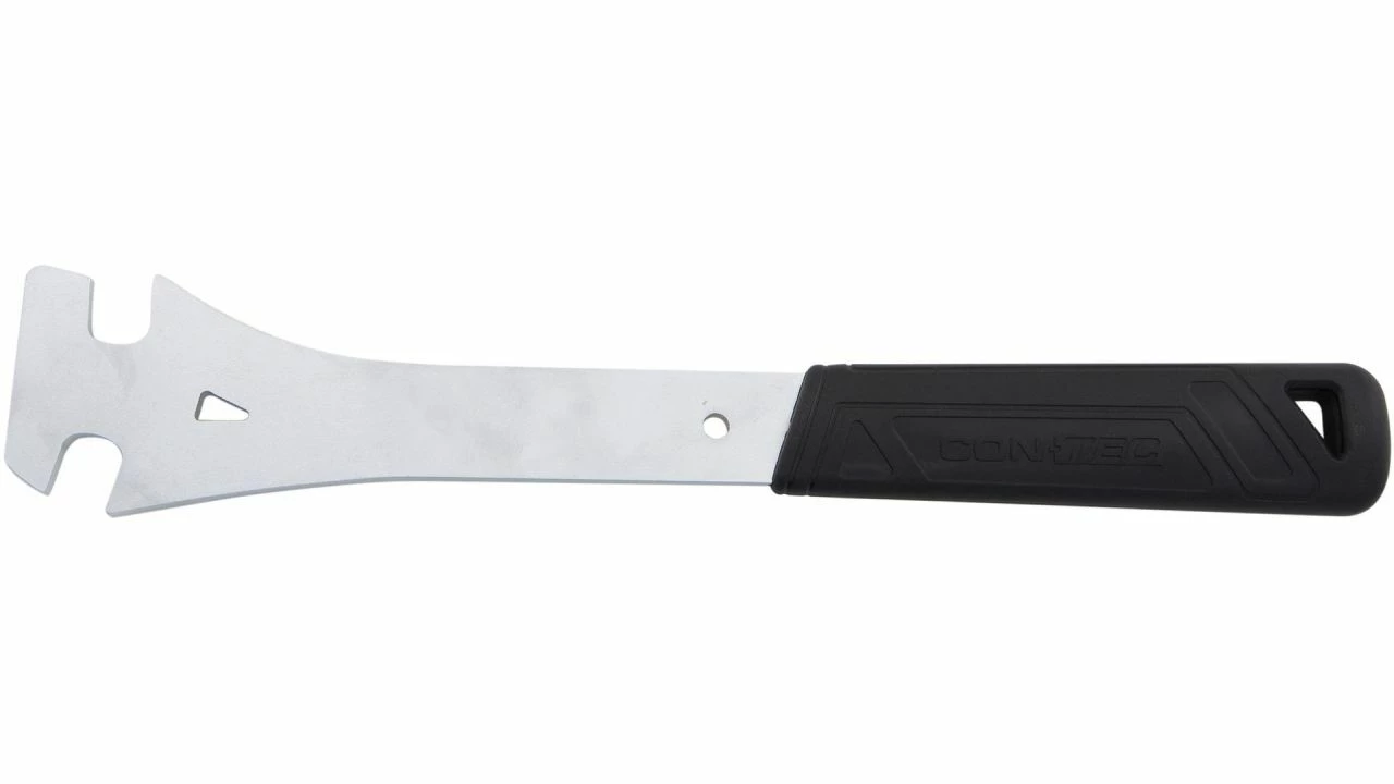 Mit dem TFP-180 doppelseitigen Pedalschlüssel von CONTEC lassen sich Pedale schnell montieren und demontieren. Aus Stahl gefertigt und mit gut in der Hand liegendem Griffteil.