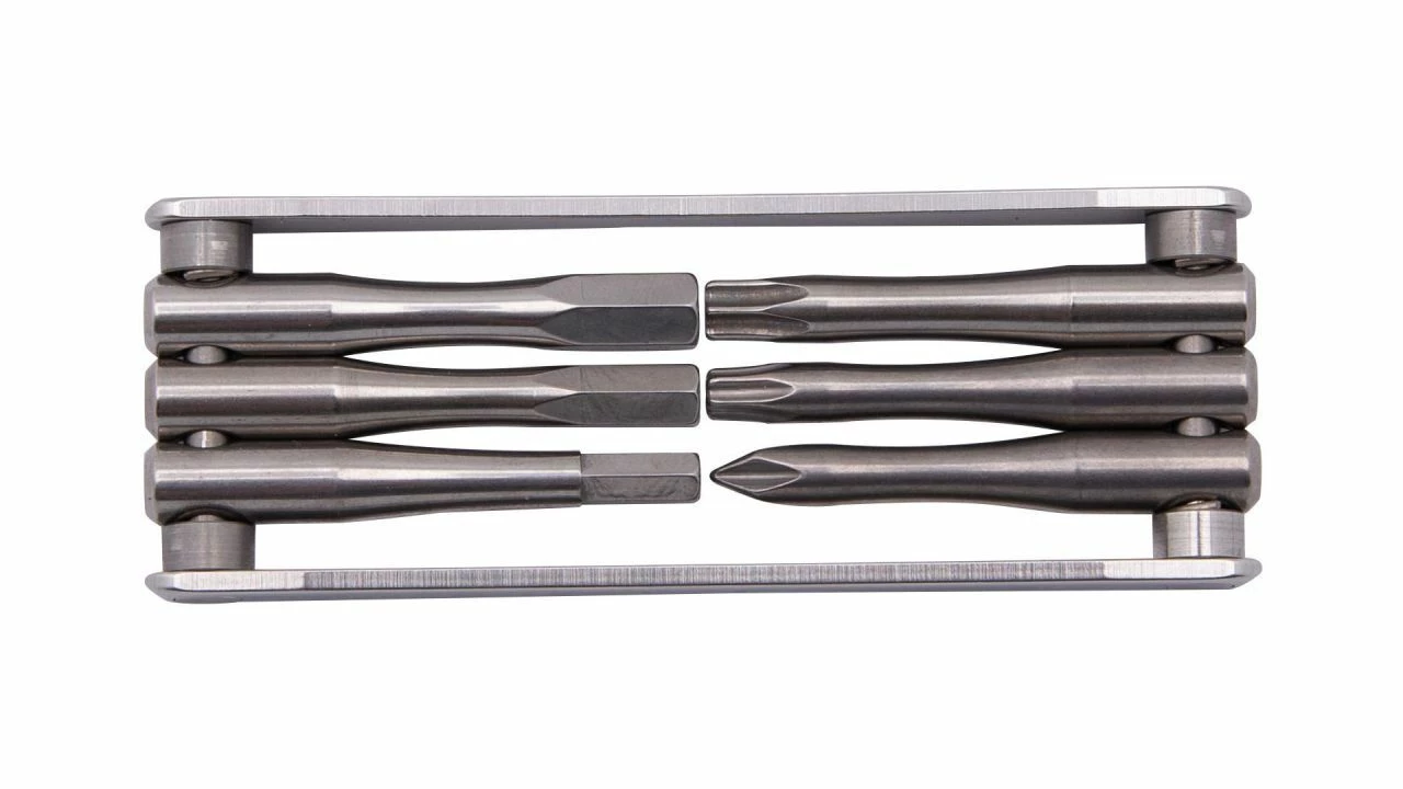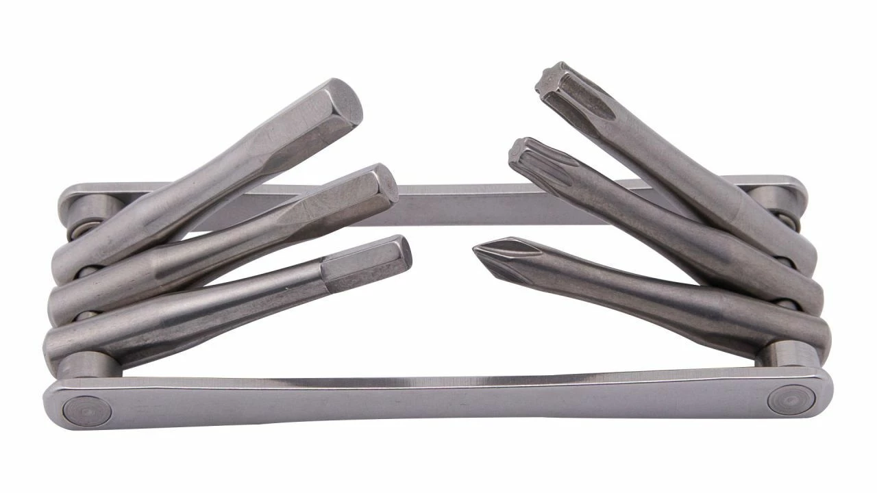 Klassisch kompakt: Das TFR Fold 6 von CONTEC ist ein kompaktes Multitool für den Einsatz unterwegs. Dafür steht das Tool for Ride mit den Maßen 90 x 34 mm und einem Gewicht von 77 Gramm. Die sechs Funktionen umfassen die Innensechskantschlüssel mit 4 mm, 5 mm und 6 mm sowie einen Kreuzschlitzschraubenzieher. Hinzu kommen die Innensechsrund-Schlüssel T25 und T30. Zum sicheren Arbeiten rasten die einzelnen Werkzeuge bei 90° und 270° ein. Aus hochfestem und rostfreiem Edelstahl gefertigt.