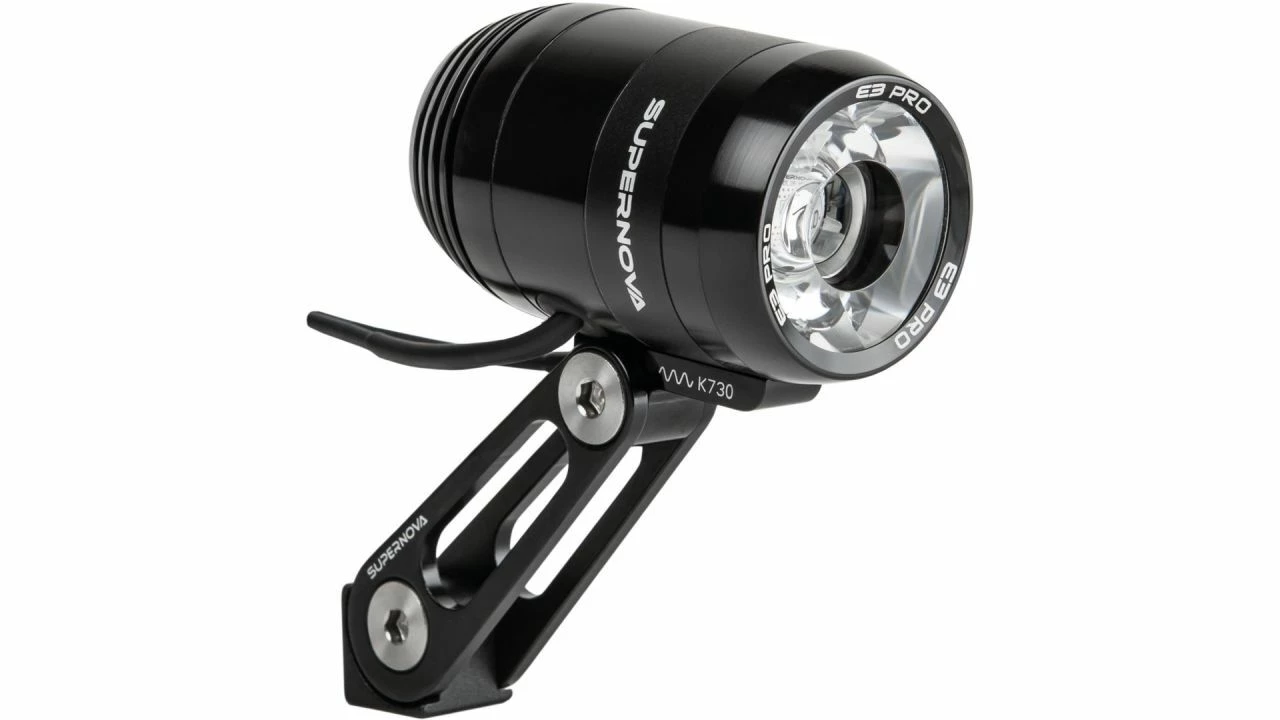 Der E3 Pro2 ist ein Klassiker unter SUPERNOVAs Dynamo-Scheinwerfern. Zahlreiche Auszeichnungen und Testsiege belegen sein Können. Er erzeugt bereits bei sehr geringer Geschwindigkeit einen hellen Lichtteppich auf der Straße, in der Spitze leuchtet er bei 25 km/h dann 205 Lumen hell. Dafür sorgen die hochwertige Power LED und der Terraflux 2 Spiegel damit man als Radreisender oder Fahrradpendler weder Schlaglöcher noch Glasscherben übersieht. <br><br>Ein wortwörtliches Highlight ist das hell erleuchtete Logo, das nicht nur optisch ein Hingucker ist, sondern auch ganz funktional die seitliche Sichtbarkeit für andere Verkehrsteilnehmer deutlich erhöht. Tagsüber erhöht das Tagfahrlicht die Sichtbarkeit signifikant. Und wenn es dunkel ist auch im Stand, denn dann leuchtet der E3 Pro2 für weitere fünf Minuten, auch das SUPERNOVA Tail Light (Rücklicht) wird gleich mitversorgt. Maße des Aluminium-Gehäuses: 69x40x40 (LxBxH) mm, Gewicht: 110 g. Inklusive Multimounthalter für Gabelkrone/Brücke.